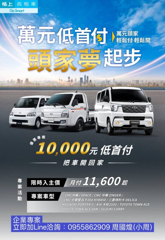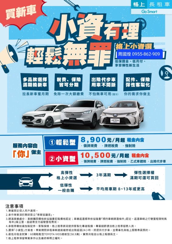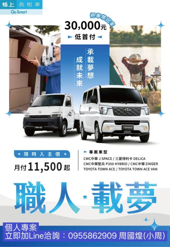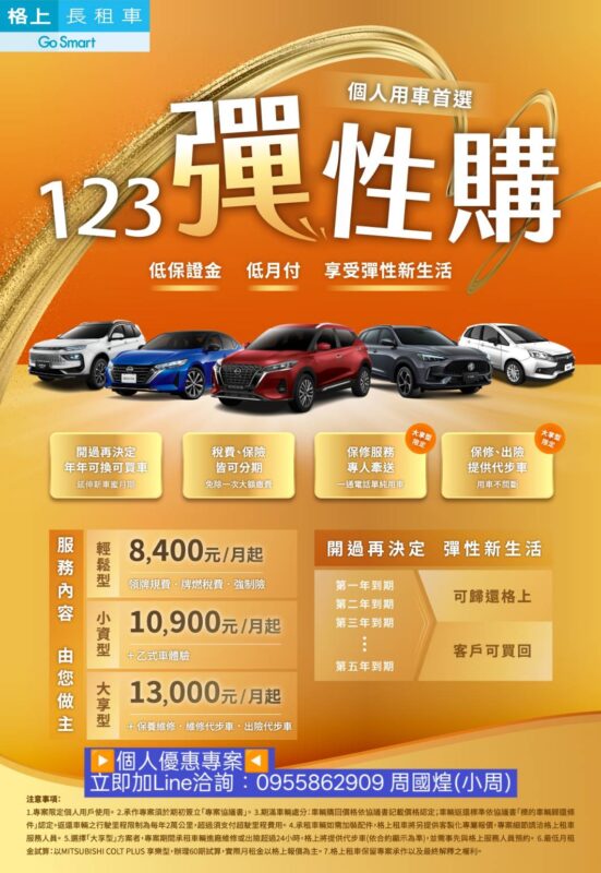 我是目前服務於「格上租車」擔任租賃業代周國煌(小周),一直秉持著「專業、真誠、客戶至上」的貼心服務為客戶著想!不管國產車、進口車、貨車、商務車,各式車款小周都能為您量身打造適合您公司的租車方案,歡迎來電或加入LINE洽詢!